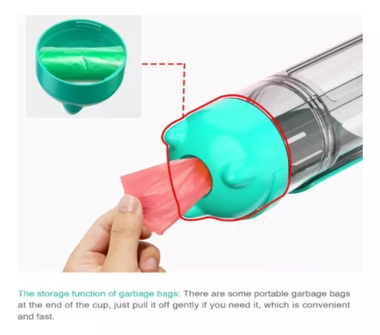 Es una botella 3 en 1 con funcionalidad (botella de comida, agua y Bolsa para caca)