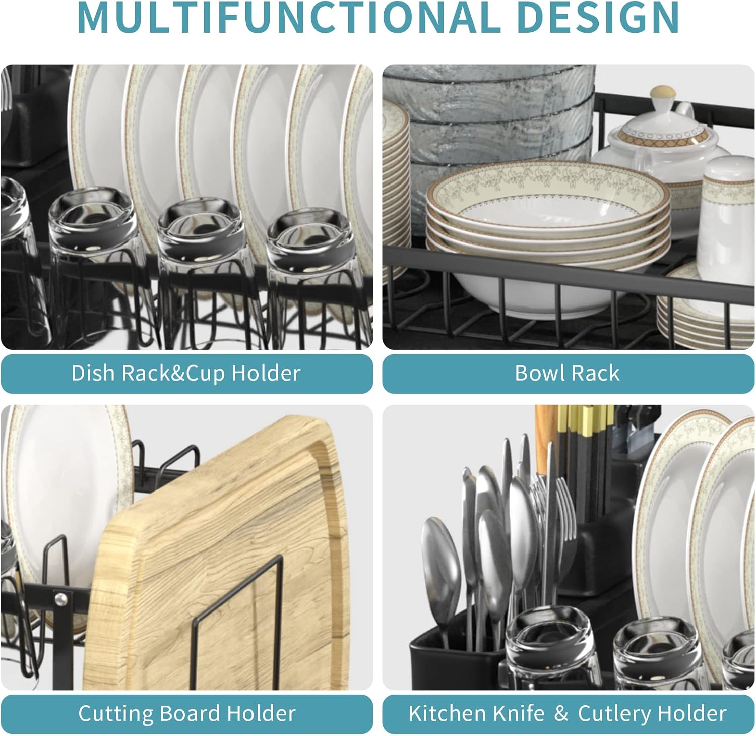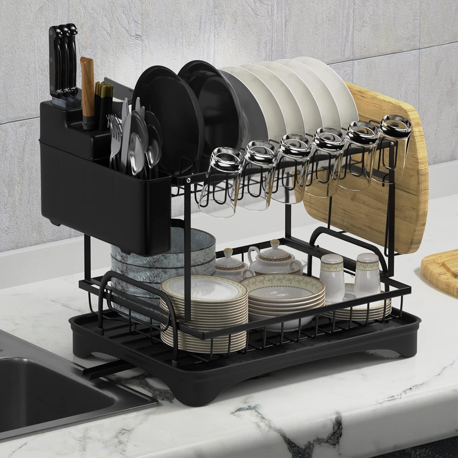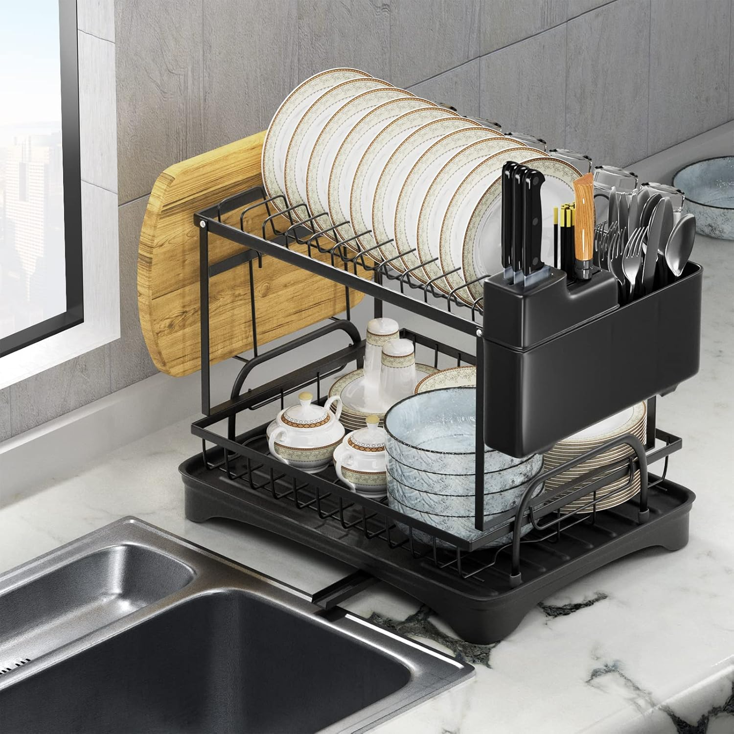 Optimiza hasta un 30% del espacio en tu encimera con este escurridor de dos niveles. La capa superior tiene capacidad para 11 platos y 6 tazas, mientras que la inferior es ideal para cuencos, ollas u otros utensilios grandes. Además, incluye un soporte lateral para cubiertos y otro para tablas de cortar, maximizando su funcionalidad y manteniendo todo en su lugar.